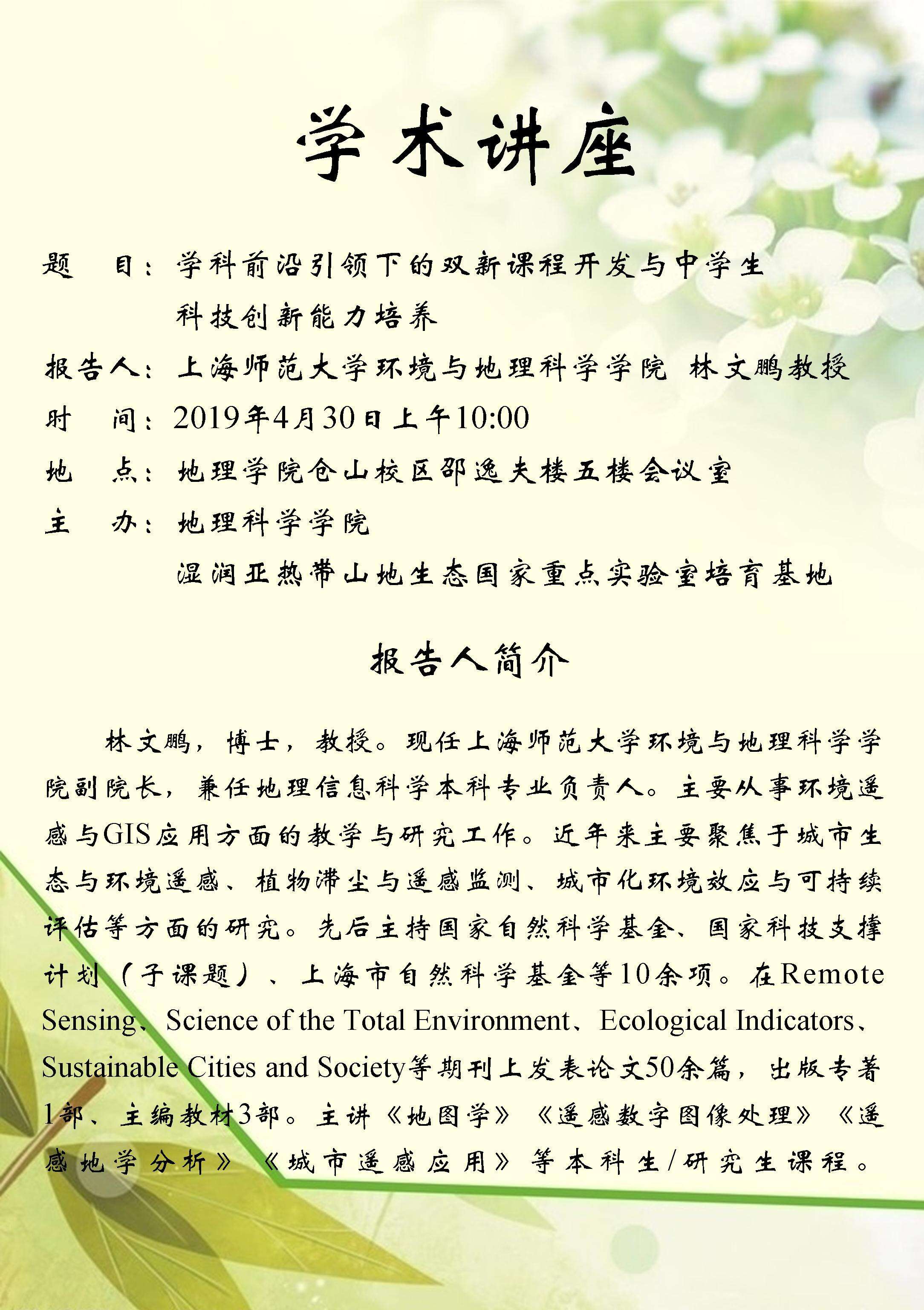 2019年4月30日“学科前沿引领下的双新课程开发与中学生科技创新能力培养”学术讲座