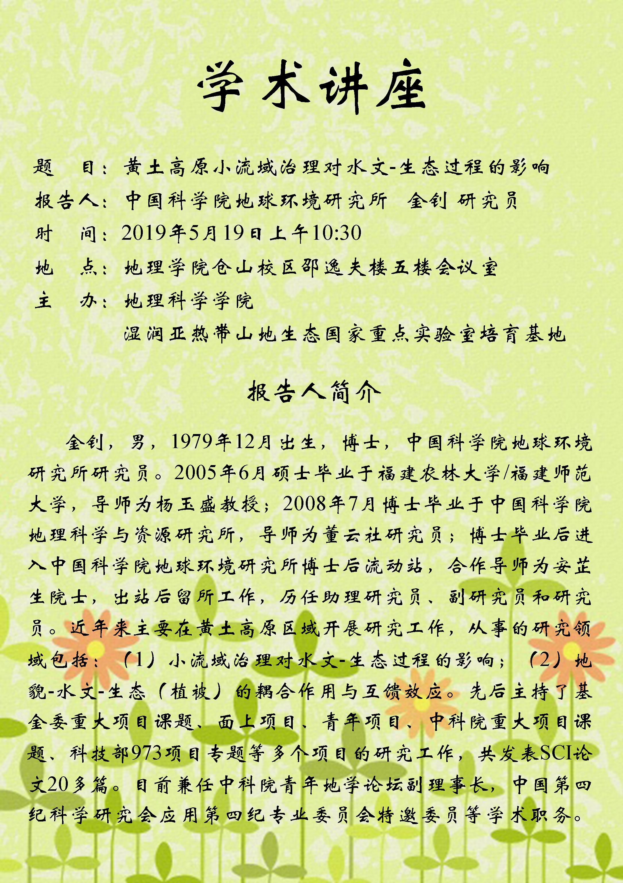 2019年5月19日“黄土高原小流域治理对水文-生态过程的影响”学术讲座