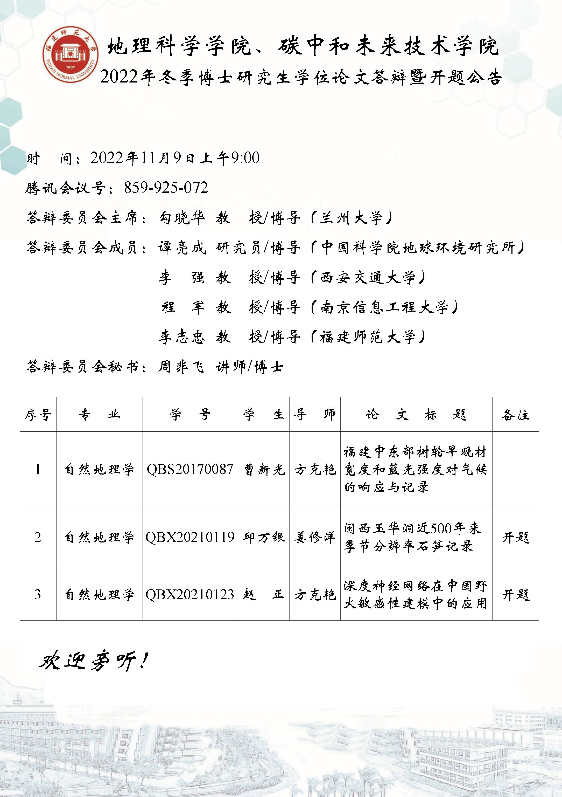 【2022年11月9日上午9:00】地理科学学院、碳中和未来技术学院2022年冬季博士研究生学位论文答辩暨开题公告