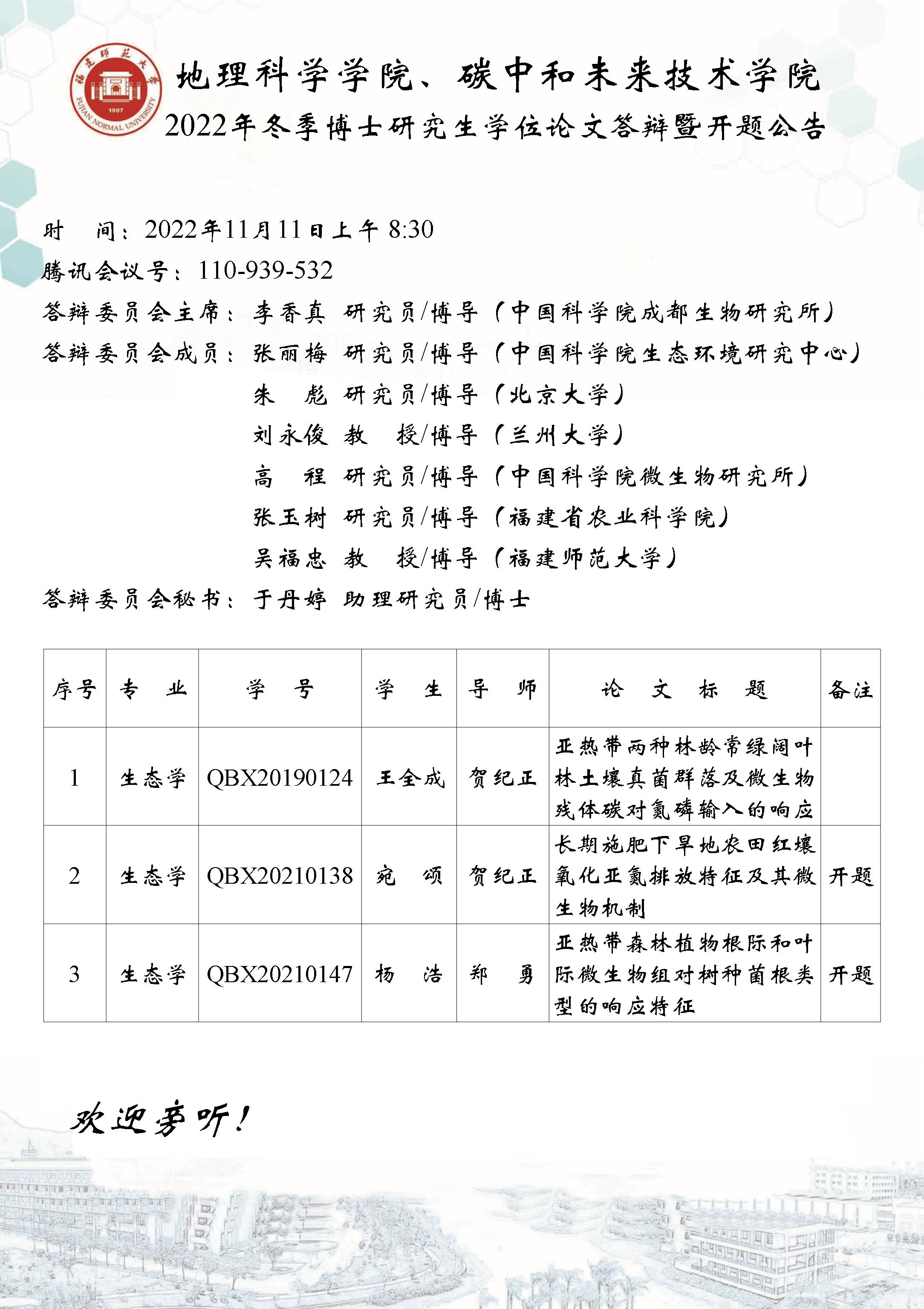 【2022年11月11日上午8:30】地理科学学院、碳中和未来技术学院2022年冬季博士研究生学位论文答辩暨开题公告(三)