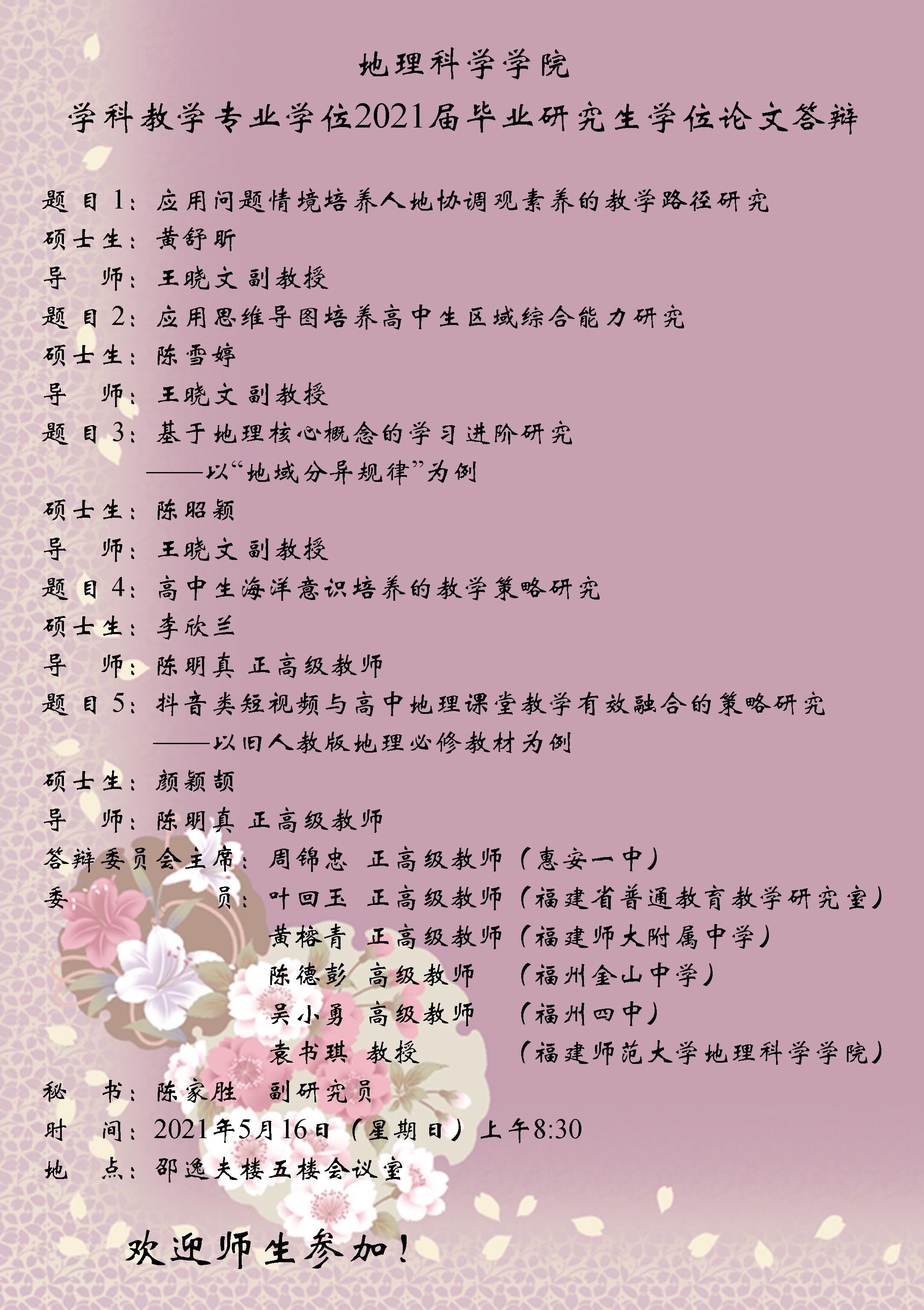 2021年5月16日“地理科学学院学科教学专业学位2021届毕业研究生学位论文答辩”