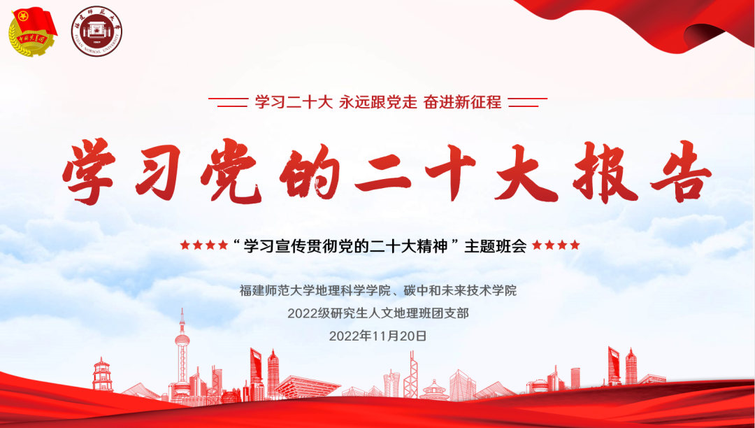 学习二十大,聚力青年行。为深入学习宣传贯彻党的二十大精神,地理科学学院、碳中和未来技术学院2022级研究生人文地理班团支部围绕“学习二十大、永远跟党走、奋进新征程”开展 “学习宣传贯彻党的二十大精神”主题班会。