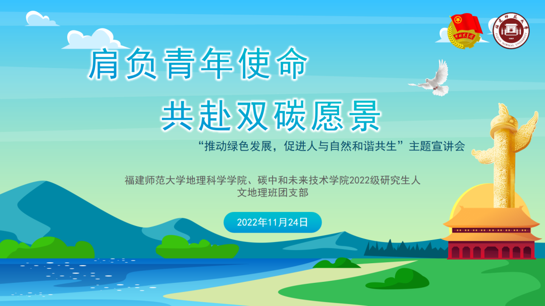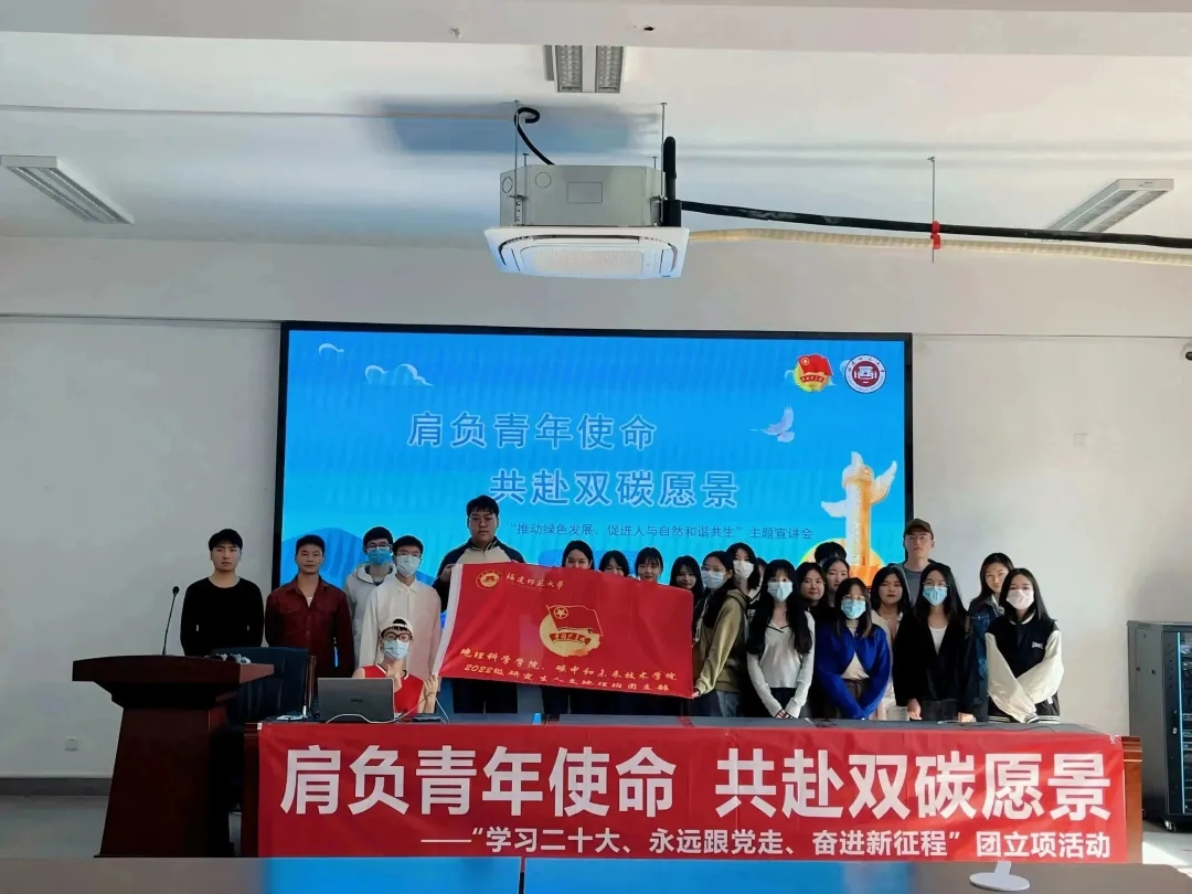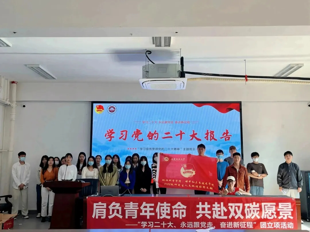 为深入学习宣传贯彻党的二十大精神,牢记习近平总书记的嘱托,争做有理想、敢担当、能吃苦、肯奋斗的新时代好青年,近日,地理科学学院、碳中和未来技术学院2022级研究生人文地理班团支部围绕“学习二十大、永远跟党走、奋进新征程”开展以“肩负青年使命,共赴双碳愿景”为主题的团支部立项活动。