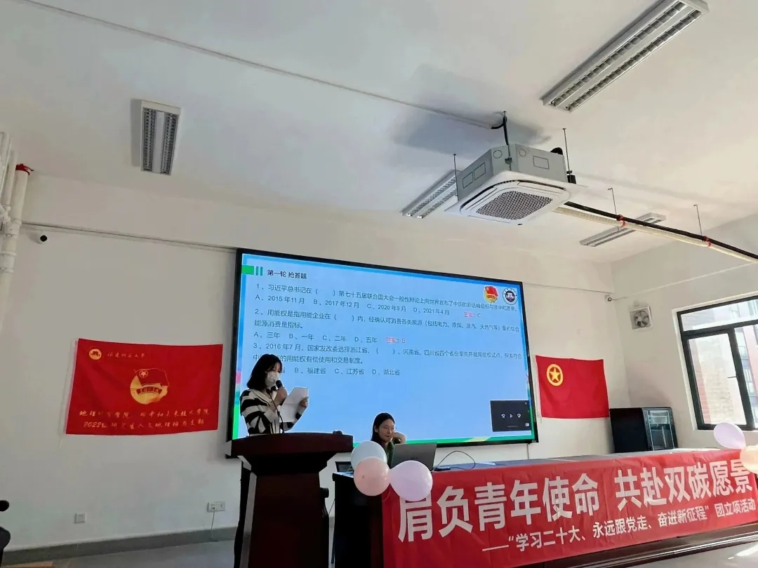 为更好地宣传科普“双碳”战略,支部组织成员们共同观看影片《第十一个小时》,并联合环境与资源学院2022级专硕研究生团支部共同举办了一场低碳节能知识竞答活动,活动中同学们积极抢答,现场气氛热烈。