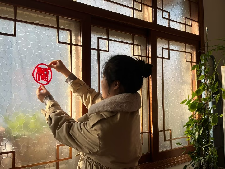 实践队员在家中体验贴“福”习俗