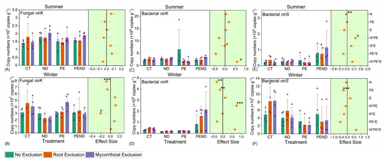 本研究揭示了细菌与真菌反硝化微生物对气候变化因子(如氮沉降和降水减少)及季节动态的差异化响应,强调在构建土壤 N2O排放模型和制定亚热带森林生态系统的科学管理策略时,应同时纳入细菌与真菌两个关键功能群体的生态作用。这些发现不仅丰富了土壤反硝化机制的理论认知,也为提升温室气体排放预测准确性和碳氮循环调控提供了重要支撑。