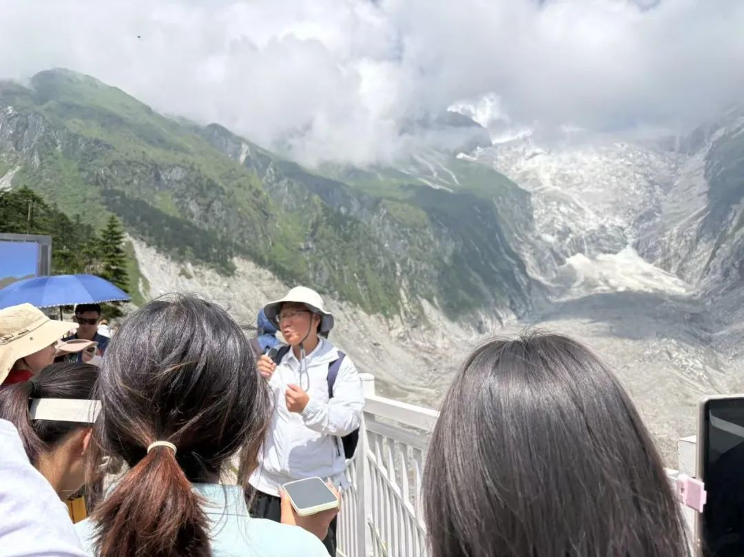 7月16日,实习队伍前往贡嘎山海螺沟冰川,旨在通过实地考察,深入探究影响地形地貌、植被分布的内外动力。从近距离观看冰川地貌的雄奇,到远望贡嘎山垂直植被带谱的分异,再到对比城门洞冰川今昔产生的生态警示,全面解码冰川的形成条件以及人与自然和谐共生之道。