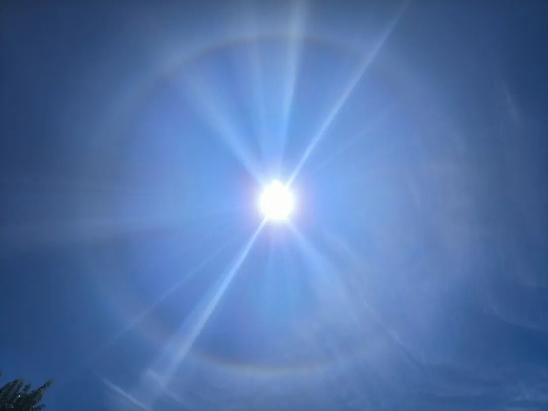 离开杀虎口时,实习队伍幸运地遇上了日晕。日晕是一种大气光学现象,它的形成原因是,在6000米至8000米的高空有冰晶构成的卷层云,卷层云中的冰晶经过太阳照射后,会发生折射和反射等物理现象,阳光便分解成了红、绿、紫等多种颜色,这样太阳周围就出现一个巨大的彩色光环,称为“日晕”。 一般说来,日晕在中、高纬出现的频率比较大,而在低纬出现的频率比较小。