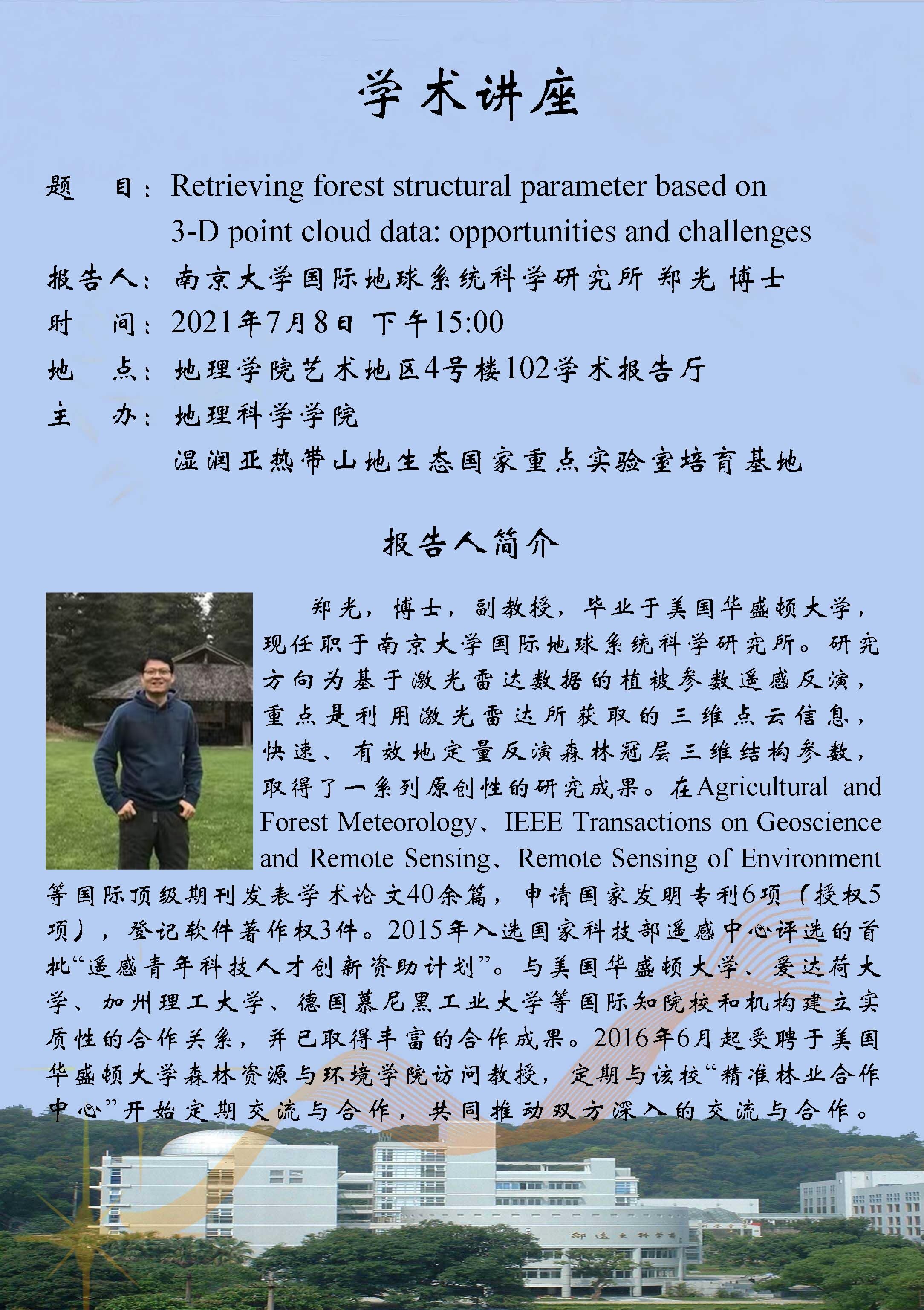 2021年7月8日“Retrieving forest structural parameter based on 3-D point cloud data: opportunities and challenges.”学术讲座