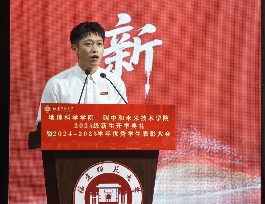 2023级自然地理学专业硕士研究生、2025级自然地理学专业博士研究生黄兴洲同学代表老生发言,他回顾在学院多年的学习生活,鼓励学弟学妹们在迎难而上中锐意创新、于厚积薄发中勇攀高峰,做有理想、敢担当、能吃苦、肯奋斗的福师地理人。