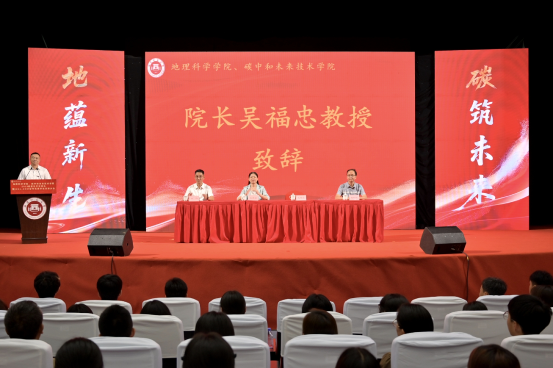 典礼在雄壮的国歌中拉开序幕。院长吴福忠教授首先代表学院致辞。他简要回顾了我院的办学历史和发展历程,详细介绍了学院近年来在教学科研、学科建设、人才培养等方面取得的成绩。他勉励全体2025级新生以家国为笔,在坚定理想信念中锚定青春方向;以实践为墨,在坚持知行合一中夯实青春根基;以创新为锋,在持续攻坚克难中彰显青春担当。最后,他与新生分享了“享受”“规则”“珍惜”三个关键词,希望全体2025级新生在探索山河、钻研技术的过程中,收获知识、增长才干,成长为堪当民族复兴大任的地理人才。