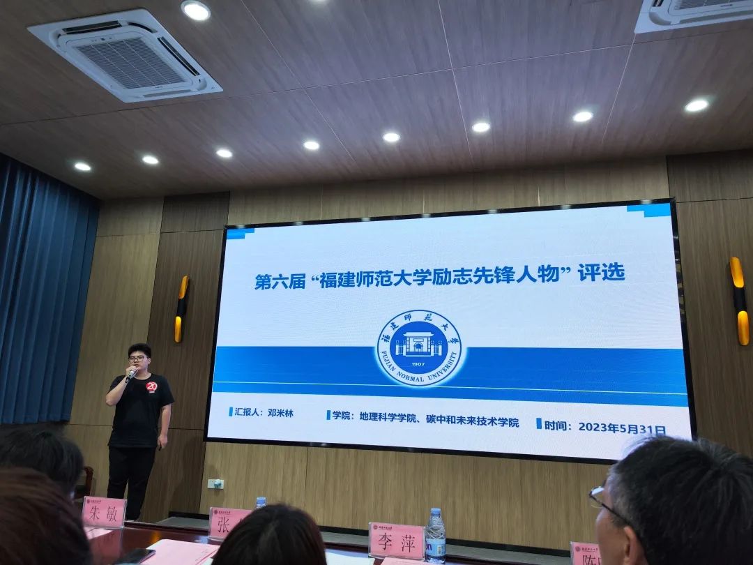 为深入学习贯彻党的二十大精神,发挥朋辈榜样示范引领作用,广泛选树宣传校园“最美受助者”风采,5月31日下午,第六届“福建师范大学励志先锋人物”现场评选活动在索莱达楼一楼报告厅举行。经学院推荐、学校初评,我院2020级本科生钱如萍获得“福建师范大学励志先锋人物入围奖”,2021级研究生邓米林入围现场评选。在现场评选环节,通过视频展播和演讲,邓米林展示了自身不平凡的成长经历和自强故事并获得“福建师范大学励志先锋人物”荣誉称号。