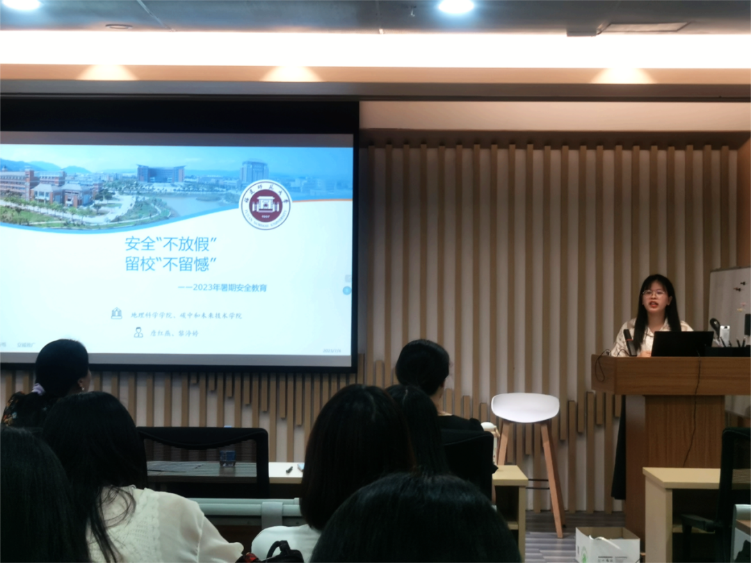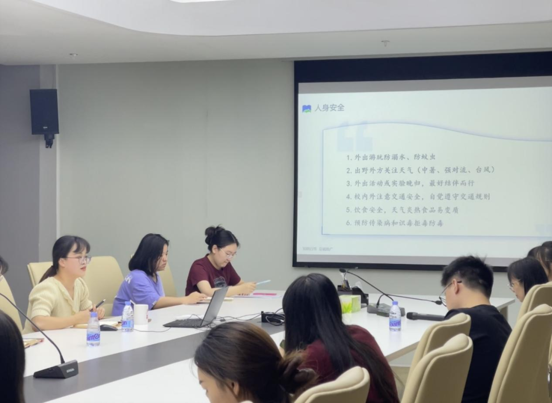随后,兼职辅导员黎渟婷从暑假安全、暑假留校管理和往年毕业生就业去向三个方面入手,向大家宣传相关安全知识,增强同学们的安全意识。同时督促留校同学利用好毕业前最后一个暑假的“黄金时间”,尽快完成毕业要求,为就业预留充足的准备时间。此外,通过分享近三年同专业研究生就业去向,引导同学们根据自身实际做好职业规划。
