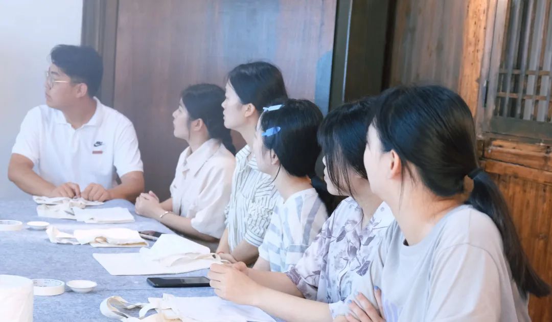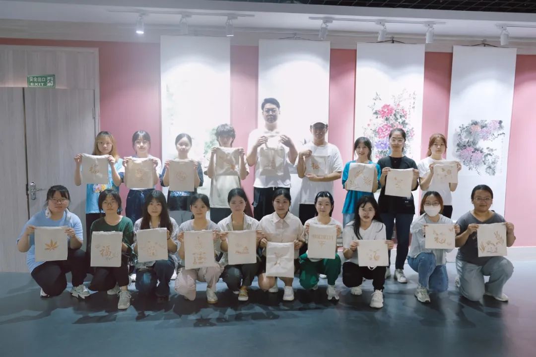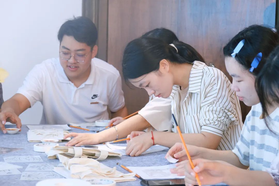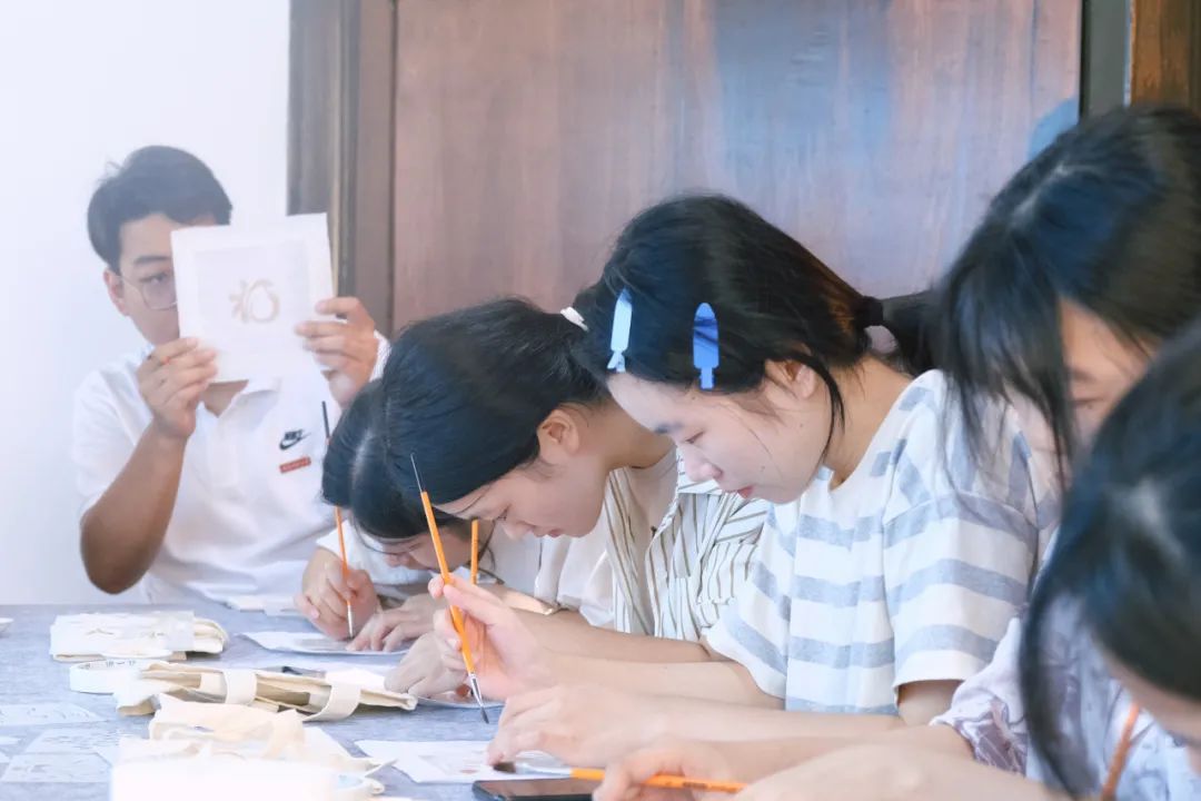 柿染作为永泰县非物质文化遗产之一,是草木染工艺的一种,其染色液是通过将尚未成熟的青色小柿子捣碎后榨汁,发酵一年以上制作而成。实践队有幸邀请到柿染项目负责人吴婧老师指导成员们进行柿染。吴婧老师与队员们分享到:“进行柿染的颜料不要蘸太多,以防晕开,最好在蘸的时候液体刮干净多划几次,每次划浅一点,这样画成以后轮廓清晰,且颜色同样会变深。”在进行柿染的过程中,实践队队员们亲身体验用柿漆作画,将刻好的版铺在布面上,用毛刷一遍遍地刷,在一次次的耐心重复中,队员们渐渐地体验到平心、静气、精益求精的工匠精神。