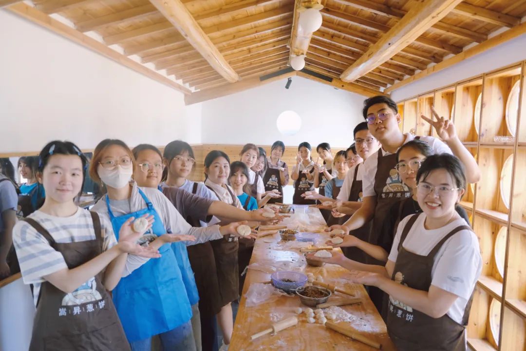 活动伊始,实践队队员们分为五组前往嵩昇葱饼店,学习并尝试制作永泰葱饼,体会永泰特有的文化韵味。据葱饼店老板的介绍:“永泰葱饼又称永泰葱肉饼,是永泰当地有名的美食之一,虽貌不惊人,但味道极佳。2018年,永泰葱饼制作技艺已成功申报为福州市第五批非物质文化遗产。”随后,在葱饼店老板的指导与帮助下,队员们围上围裙,将面团擀成薄片,舀一勺肉馅,包入适量葱花,将封口压扁,均匀摆放到洒满芝麻的竹匾上。刚出炉的葱饼,咬一口酥脆无比,唇齿留香,古朴平凡的味道让队员们感受到难以忘怀的文化传承。