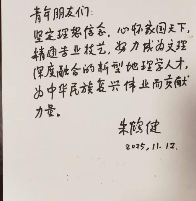 2025级自然地理学博士研究生杨巧:感谢朱鹤健老师为我们构建起成熟的地学思维框架,能让我在庞杂的地理学系统中认清自己的定位与前进的方向,让我在面对难以攻克的困难时学会持之以恒,在学科林立的科学界中坚定不移的走自己的地理学道路。现在的我仍然只是一个“描述与解释世界”的人,但我想做“参与设计与优化世界”的人,我也愿意为这份事业付诸努力。朱鹤健老师对未来中国地理学的期盼也是我们的期盼,愿一切尝试都能有其价值,愿所有付出都能不被辜负,愿有一日能最大程度上实现人与自然的可持续发展。