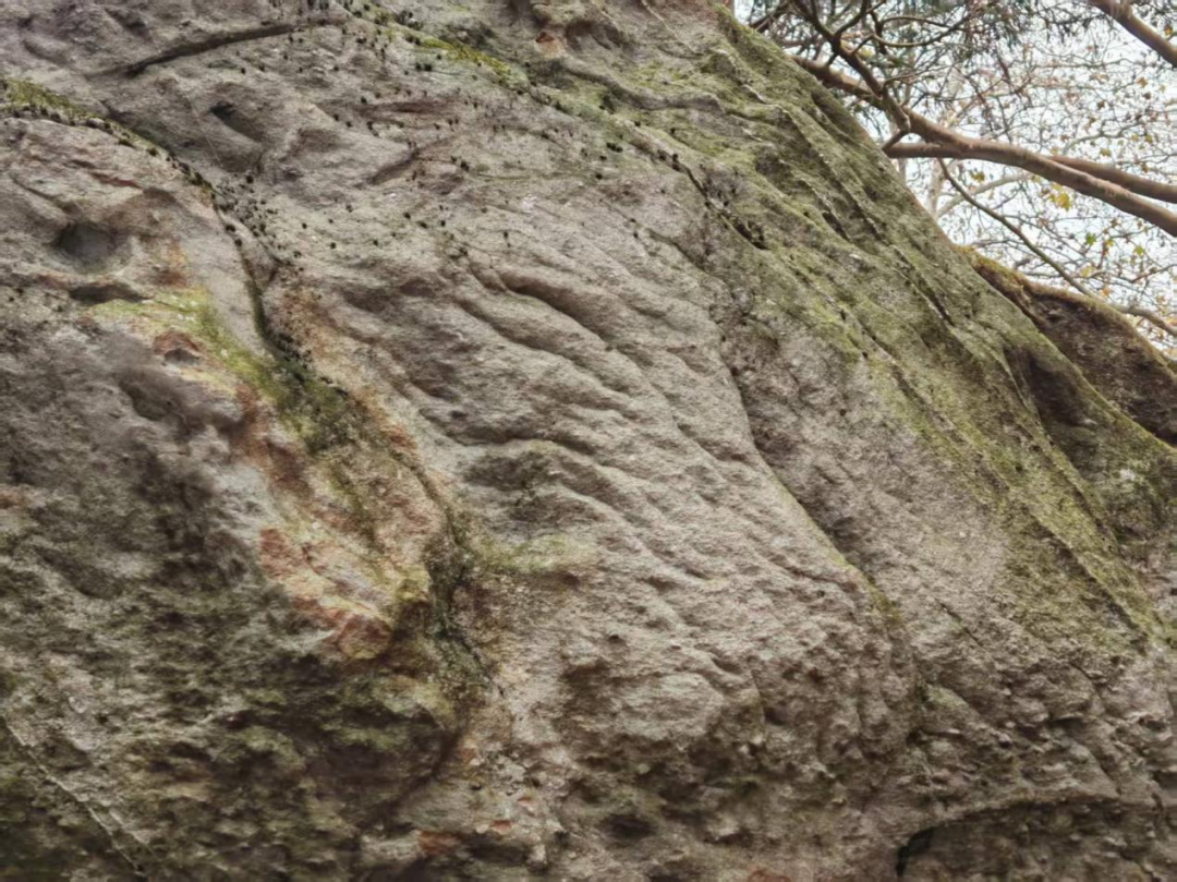 师生们对飞来石的来历、结构进行研讨。首先雷国良老师提出问题:这块巨大岩石存在的缘由以及上下层叠构造的成因。接着同学们自由观察触摸岩石,发现存在挤压变形的波浪状纹路,且岩石上夹杂颗粒的粗细大小、磨圆度、颜色等微结构不相同。最后靳建辉老师告诉答案:通过搬运能力强弱我们可以推测出是冰川搬运,通过该岩石的结构和构造特征则可以推测出这是沉积岩通过变质作用形成的变质岩。