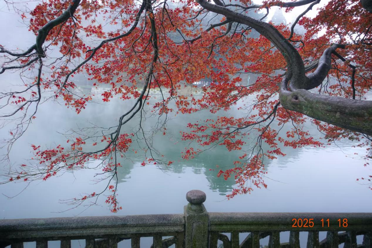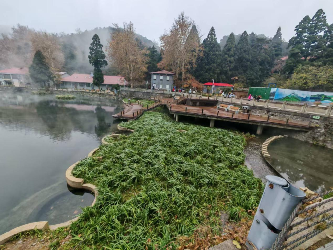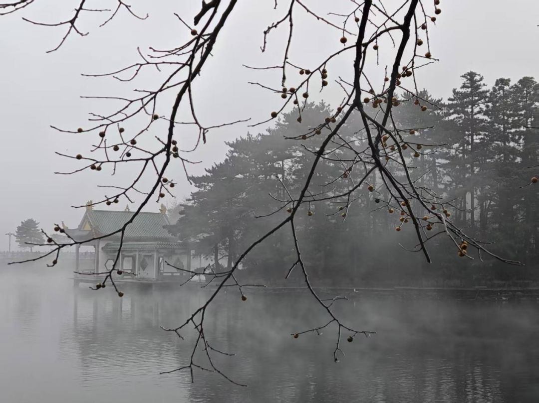 10时许,实习队伍抵达如琴湖。湖面因晨雾缭绕宛若仙境,岸边青松披霜,九曲桥蜿蜒至湖心岛,“水声如琴”的石刻与花径相映成趣。靳建辉老师现场讲解湖水净化系统:“生活污水先经沉淀池预处理,再通过水生植物吸附净化,最终汇入湖泊。”同学们认真记录讲解要点,思考如何将自然景观转化为地理课堂的生动素材。