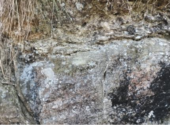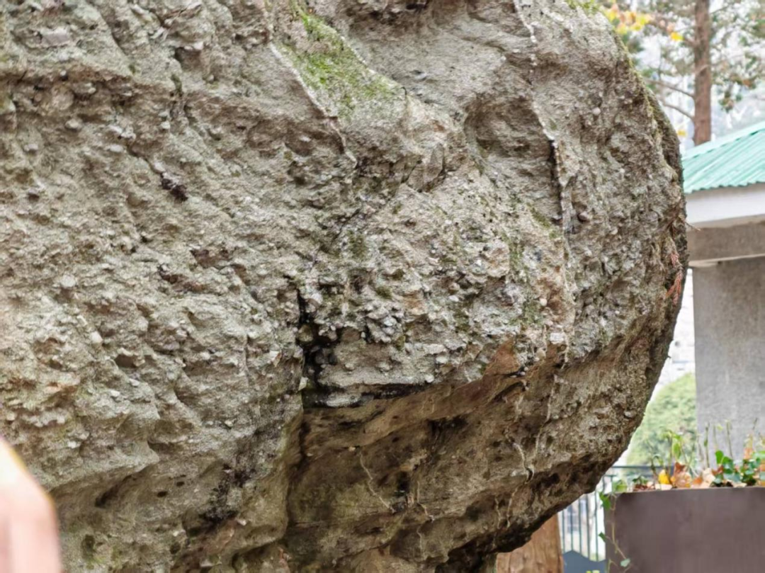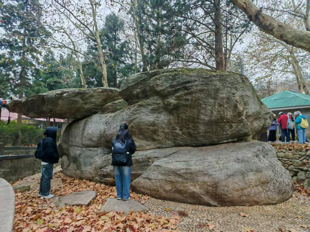 11月18日早上9点,实习团队前往飞来石进行考察。飞来石是震旦纪于西谷冰川中由于冰川活动而形成的,两边的山石落到冰川上,冰川融化后落到下边的基岩上。由两块巨石交叠而成。岩石为石英砾岩挤压变质而成的变质岩,上下两块岩石的纹理并不协调。李四光先生形象地称之为“冰桌”。