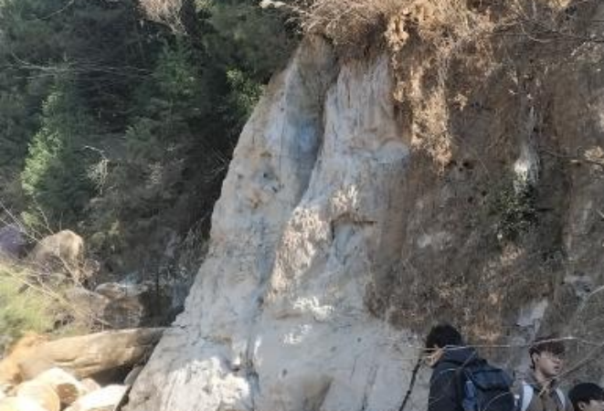 随后,队伍步行至太乙峰休息点,老师围绕五老峰考察任务展开部署。目光投向远处长条形山脊,老师重点强调:“判断刃脊是否为冰川成因,核心是观察脊两侧是否存在圈椅状洼地(冰斗)”,同时明确行进路线——从太乙峰出发,沿左侧下坡路进入五老峰,全程不折返,为后续考察划定清晰方向。抵达五老峰后,同学们先体验了一峰至五峰的平缓山路,沿途层层叠叠的岩层让大家对区域地质构造有了初步感知。