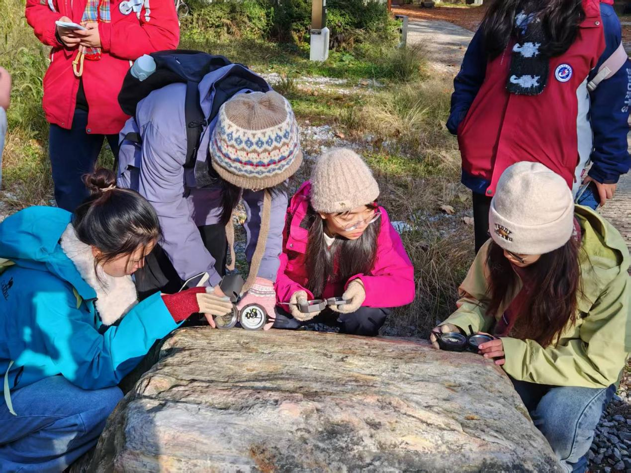 在庐山野外实习第四天,11月22日上午,实习团队首站抵达庐山植物园,这里成为解析地质结构的天然课堂。雷国良、靳建辉老师结合地形图,系统讲解庐山地区向斜与背斜的构造体系,重点拆解大悦山背斜、清莲寺谷地向斜的地层分布特征,通过 “地层下老上新” 原则教大家区分褶皱类型。同学们认真记录不同区域地层标注(如nh1l1、nh1l3),观察岩性颗粒差异与植物生长的关联。老师特别提醒:“地质图仅反映地表岩层出露情况,需结合实地观测推断地下构造。”
