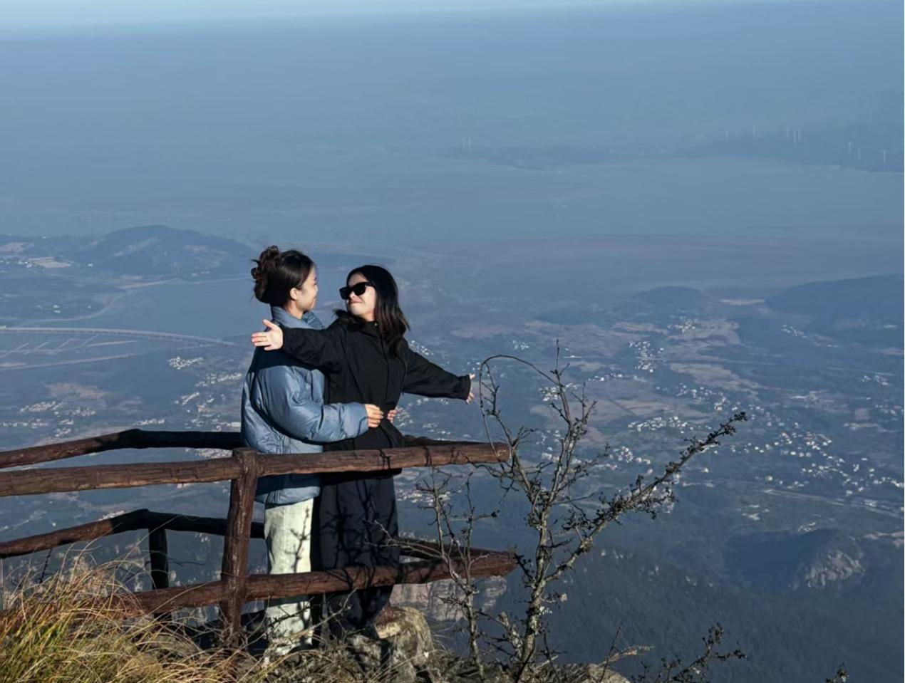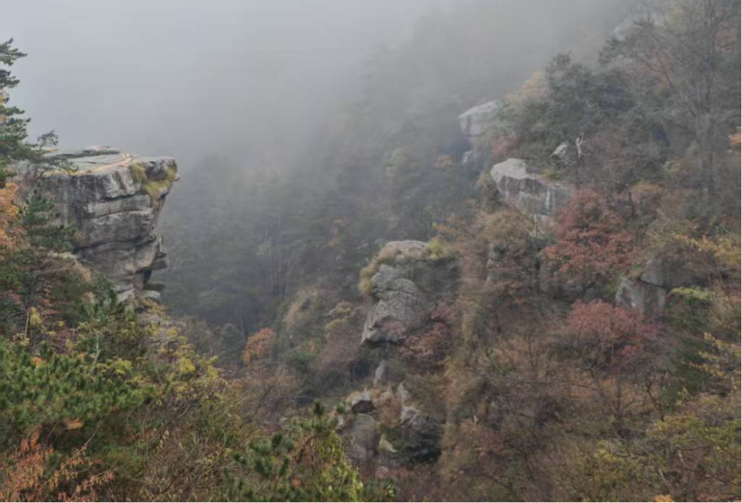2025年11月21日上午,实习团队首站抵达含鄱口,这里既是俯瞰鄱阳湖的观景胜地,也是地形定位实训的天然课堂。同学们手持地形图,在老师指导下锁定 “中间竖线最下方左侧” 的标注点,结合实地视野确认此处为太乙峰延伸的脊状地形,等高线 “高→低” 的指向与现场地貌完全契合。行走在笔直平坦的岭脊步道上,两侧陡峭岩壁形成 “夹道” 景观,让大家直观感受 “岭状地形” 的形态特征;步道旁的岩石堆中,球形风化石尤为引人注目,其圆润无棱角的表面、裂隙处集中风化的痕迹,正是砂岩球状风化的典型写照,同学们现场记录特征,为后续教学积累直观素材。