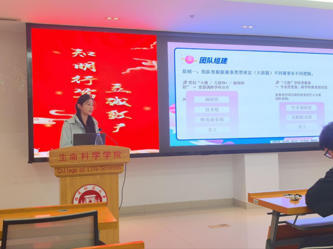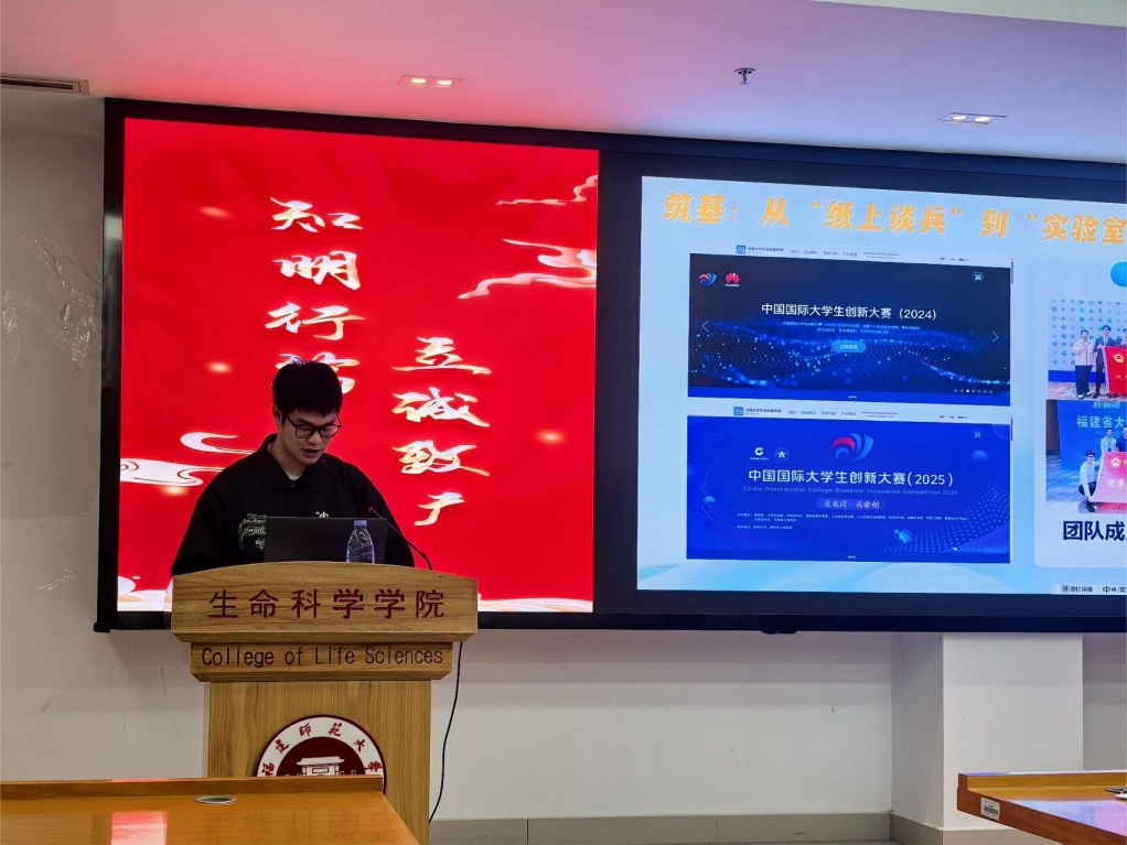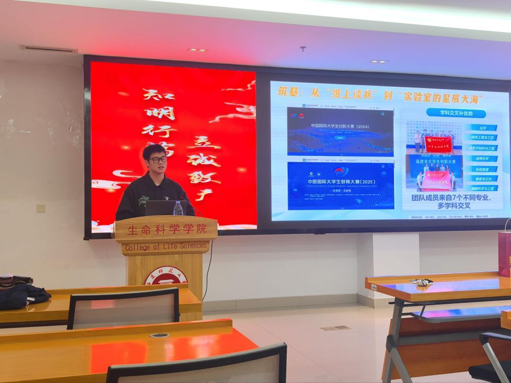 曾获第十九届“挑战杯”大学生课外学术科技作品竞赛一等奖的倪林睿,在分享中先是概述了“中国国际大学生创新大赛”和“挑战杯”等竞赛。而后,他从赛事组织者与参赛者的双重角度,剖析了优秀项目的共性特征与评审要点。他深刻而具体的分析使同学们能更全面的认识科创竞赛。