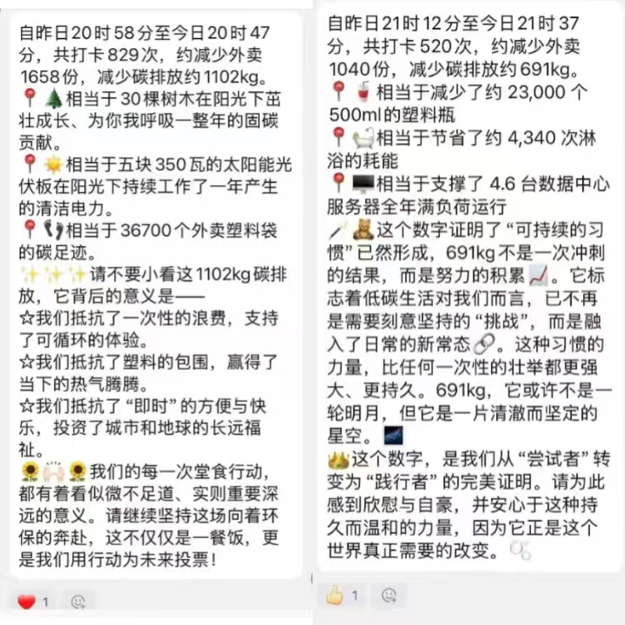 面对高校普遍存在的外卖依赖与餐饮浪费问题,本次活动旨在通过持续的集体实践,探索行为改变的可行路径。活动设计了兼具趣味性与挑战性的打卡机制,将抽象的环保理念转化为“每日堂食+光盘”的具体行动,让参与者在亲身实践中感知绿色生活方式的实质内涵。