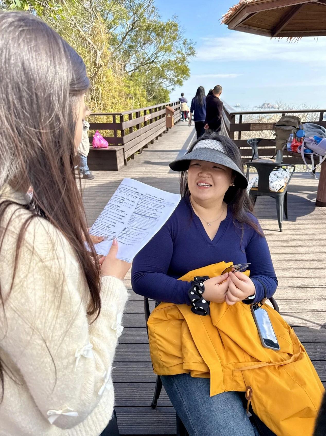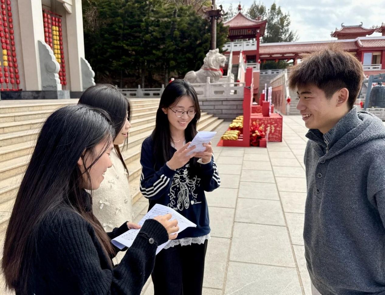 在祖庙正殿前广场及文创商店周边,实践队成员分组面向正在进行参拜、参观或休息的在岛台湾青年、本地青年学生、两岸游客及长期信众发放了调查问卷。聚焦两岸青年对妈祖信俗的认知、参与频率、地方依恋强度及跨岸交往经历。通过现场讲解与辅助填写,实践队获取了关于两岸青年群体在认知、情感与行为层面的初步量化数据,为探寻“以情促融”的微观基础提供了依据。
