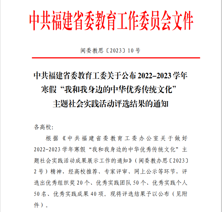 据悉,本次2022-2023学年寒假“我和我身边的中华优秀传统文化”主题社会实践活动评选经高校推荐、专家评审、网上公示等环节,共评选出优秀组织奖20个、优秀实践团队50个、优秀实践个人50名、优秀实践成果40项。