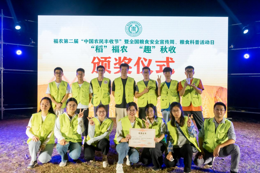 经过热火朝天的水稻收割劳动比赛后,福农第二届中国农民丰收节暨全国粮食安全宣传周、粮食科普活动日颁奖仪式正式开始,颁奖仪式由福建农业职业技术学院乡旅学院副院长郑宗沧主持并宣布获奖名单。在我院师生的辛勤劳作和共同努力下,我院取得了“二等劳动榜眼奖”的佳绩。