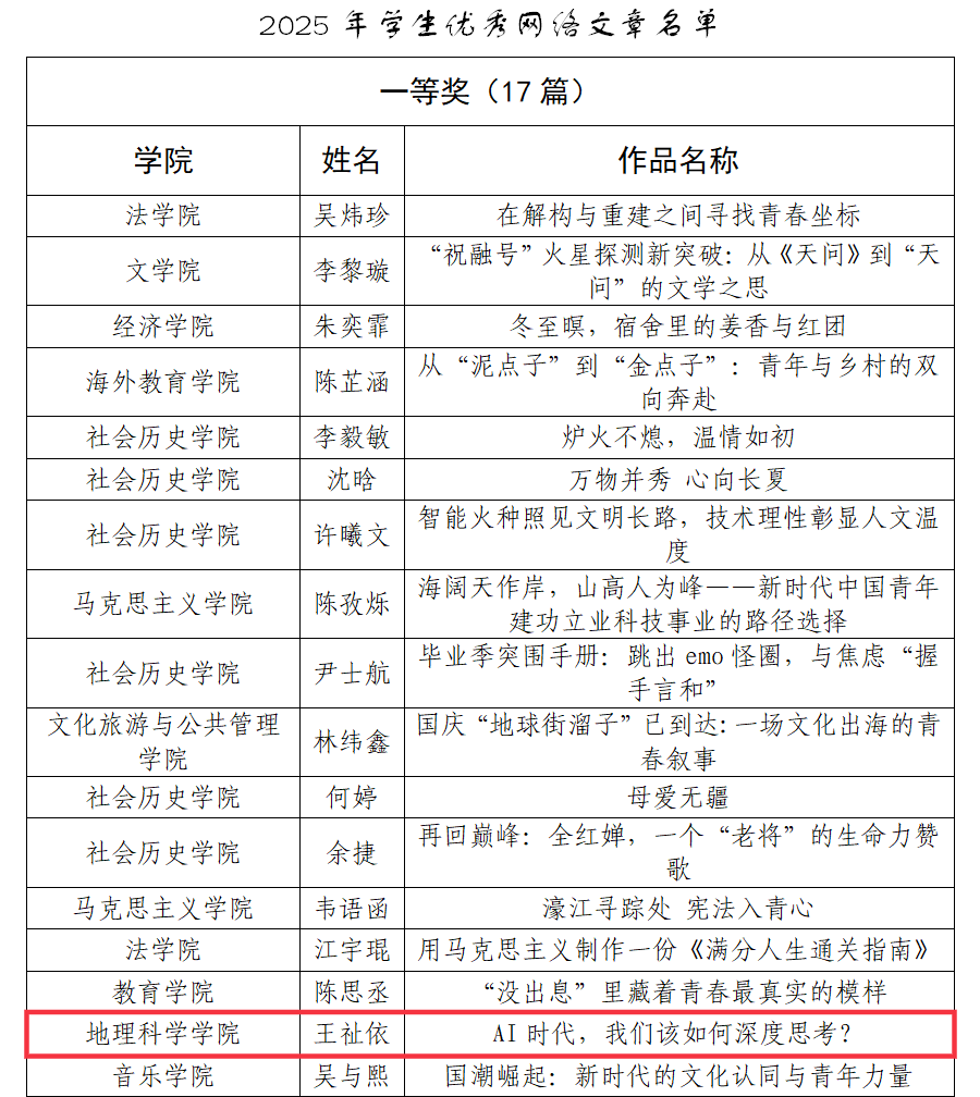 此次获奖,是学院坚持立德树人、深耕文化育人的生动体现。未来,学院将持续加强网络文化建设,搭建更广阔的创作展示平台,引导广大青年学子以笔为媒、以文践行,主动担当时代使命,积极传播正能量,在网络空间展现地理学子的责任与风采。