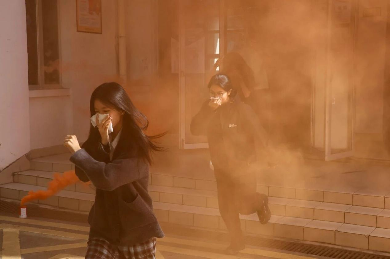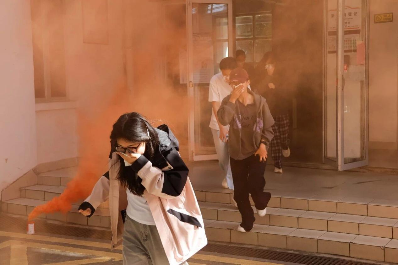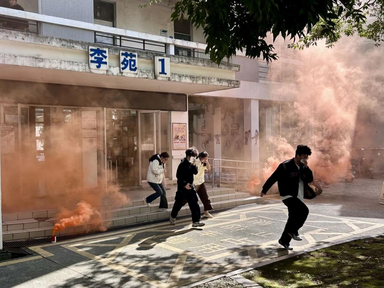 演练背景为宿舍楼栋突发火灾。随着演练逃生信号发出,各宿舍学生用湿巾捂住口鼻,降低身体姿态迅速有序出门,在现场安全志愿者的引导下从就近安全出口疏散撤离至楼外开阔地带,过程严密规范、行动高效,参演学生全部安全疏散,演练取得预期效果。