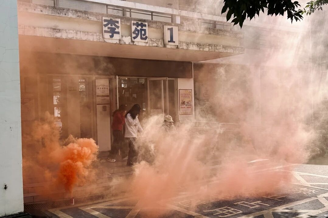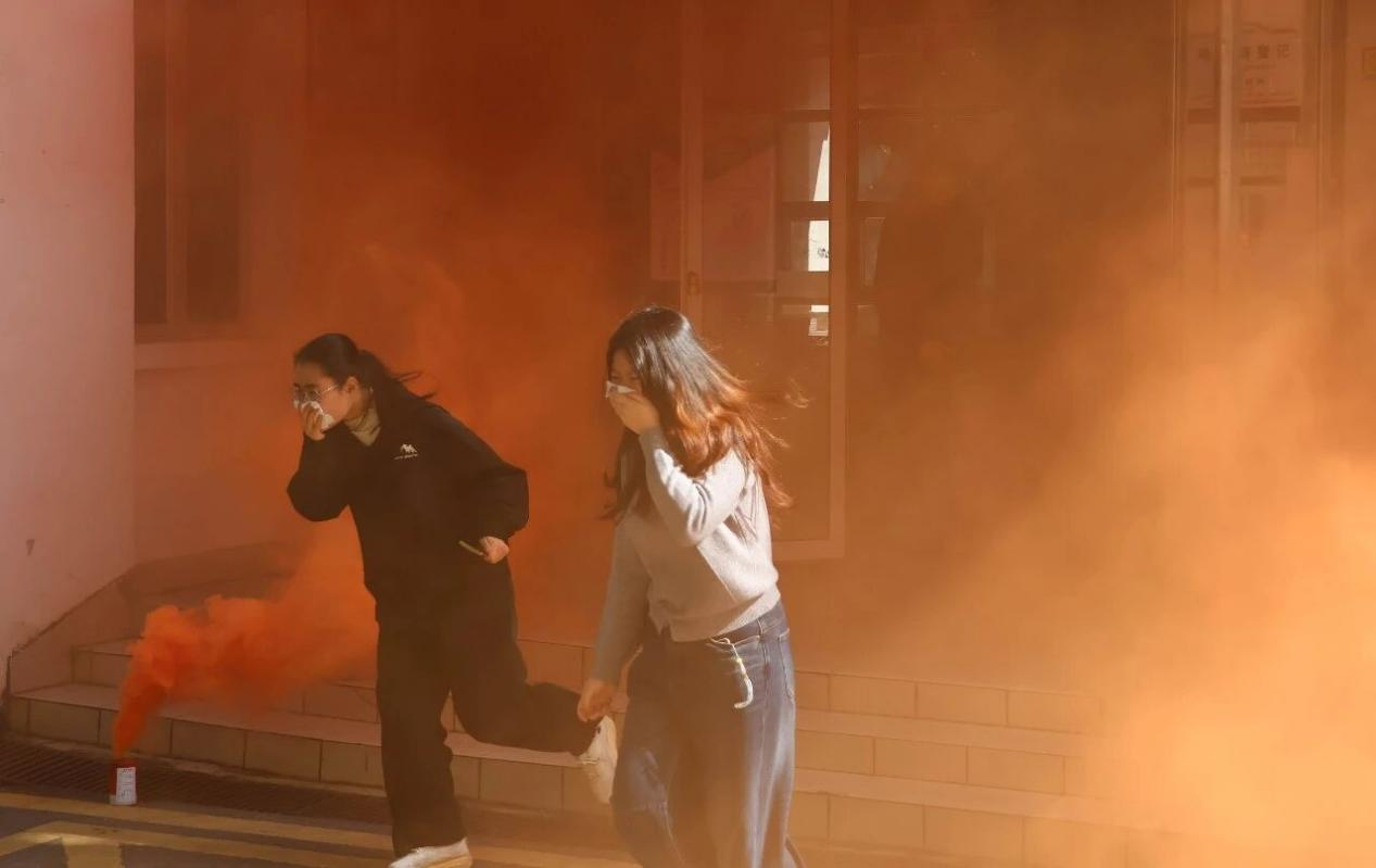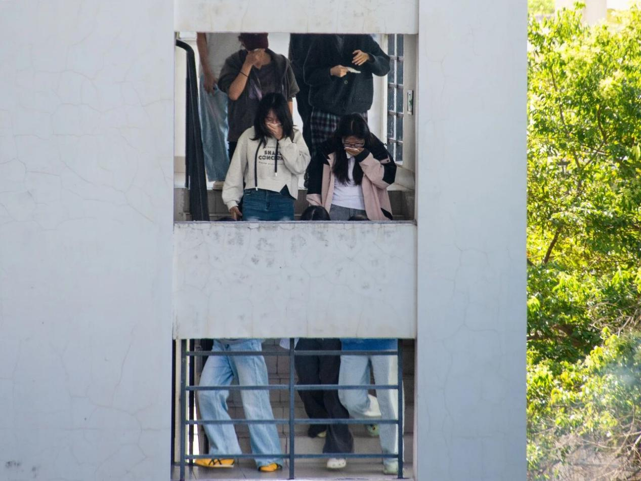 演练背景为宿舍楼栋突发火灾。随着演练逃生信号发出,各宿舍学生用湿巾捂住口鼻,降低身体姿态迅速有序出门,在现场安全志愿者的引导下从就近安全出口疏散撤离至楼外开阔地带,过程严密规范、行动高效,参演学生全部安全疏散,演练取得预期效果。