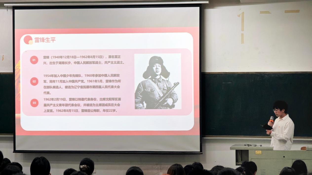 宣讲伊始,陈子浩同学围绕雷锋精神进行主题宣讲。他从雷锋生平、雷锋同志的经典语录、雷锋精神的核心内涵以及发扬雷锋精神四个层面展开,生动讲述了雷锋同志无私奉献、爱岗敬业的感人事迹。陈子浩同学鼓励同学们以雷锋同志为榜样,积极参与志愿服务,把小我融入大我,在奉献中实现青春价值。