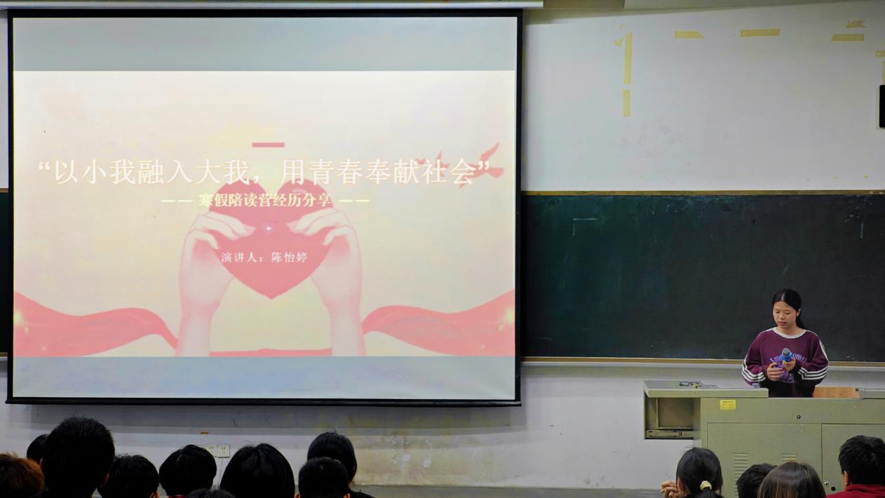随后,陈怡婷同学以“把小我融入大我,用青春奉献社会”为主题,分享了寒假陪读营的实践经历。她详细讲述了在陪读营活动中,为孩子们进行一对一或小组辅导的暖心故事,以及走进眼科医院开展眼科知识科普的志愿服务过程。陈怡婷同学结合自身经历,分享了将个人理想融入党和国家的伟大事业中的深刻感悟,号召同学们在实践中锤炼本领,用青春奉献社会。