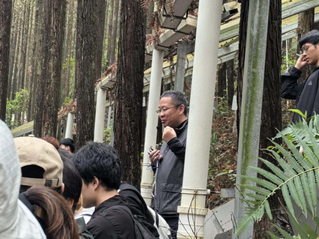 实习首站,师生们来到福建三明森林生态系统国家野外科学观测研究站。第一个实习点,杉木林隔离降雨研究平台。吕茂奎老师为大家详细介绍了平台的实验设计与研究目标,系统阐释了隔离降水对杉木人工林碳汇功能的影响机制。姚晓东老师与李守中老师结合现场实验设施,进一步拆解了“隔离降雨×氮沉降”双因子交互实验的原理,深入剖析了水分养分失衡、群落结构变化等核心科学问题,让同学们直观理解了气候变化背景下森林生态系统的响应规律。