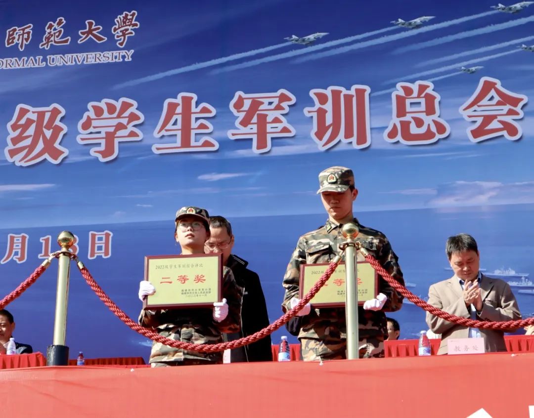 1月18日上午,福建师范大学2022级学生军训总会操在东区田径场隆重举行。经过队列训练、战术训练、格斗术、战场医疗救护、歌咏比赛、队列行进以及内务卫生七个单项评比科目的激烈角逐,我院在本次军训综合评比中以队列训练第一名、战术训练第六名、歌咏比赛第五名,总分第五名的佳绩斩获二等奖。辅导员刘松岳获“优秀辅导员”荣誉称号,承训教官获“优秀教官”荣誉称号。