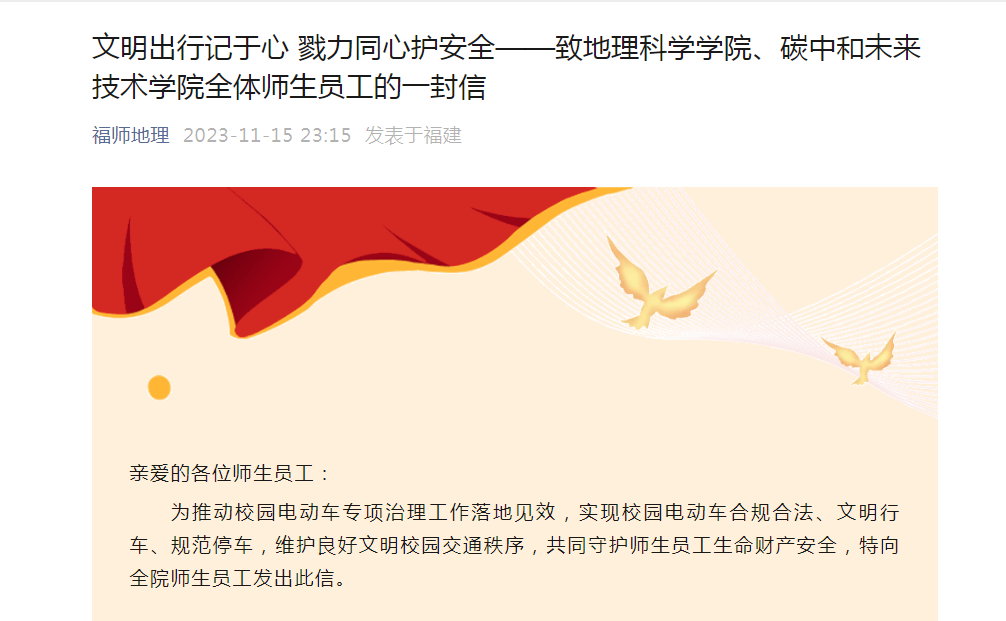 为提升全院师生员工对学校、学院电动车管理规章制度的了解熟悉程度,筑牢师生员工校园交通安全意识防线,我院向全院师生员工发出《文明出行记于心 戮力同心护安全——致地理科学学院、碳中和未来技术学院全体师生员工的一封信》,要求全院师生员工坚决率先垂范当好表率,积极主动学习、严格执行落实电动车管理相关规章制度,依法依规文明骑行,共同守护校园交通安全。