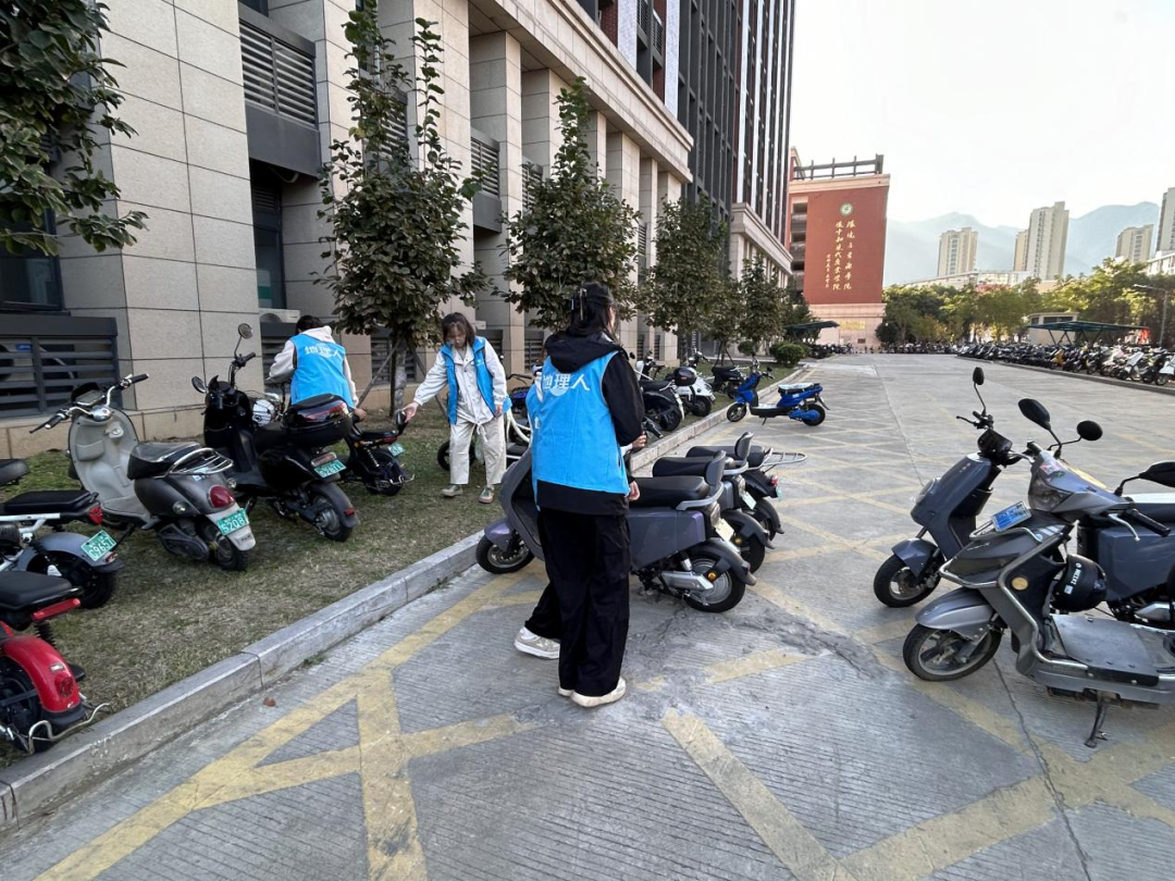 我院成立由院党委副书记为负责人、各年级辅导员带班、学生志愿者参与的学院电动车文明督导队。督导队每日在学院楼、学生宿舍楼、教学楼等场所开展电动车违规停车、不戴头盔骑行等不文明行为劝阻督导工作,坚持从源头上防范不文明骑行、不规范停车现象,确保消防通道畅通,降低校园交通事故发生概率。