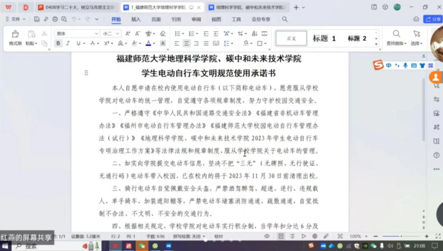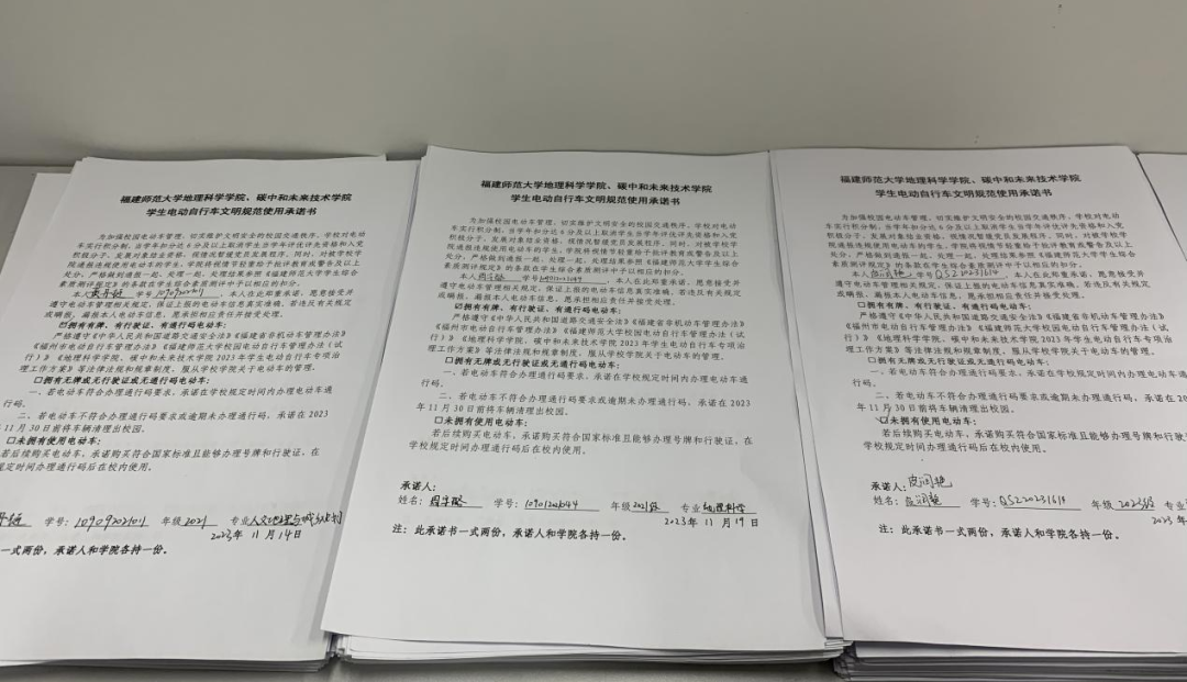 为提升电动车治理成效,我院组织学生签订《福建师范大学地理科学学院、碳中和未来技术学院学生电动自行车文明规范使用承诺书》,进一步强化学生安全意识和规矩意识,提醒学生加强自我管理、自我监督。