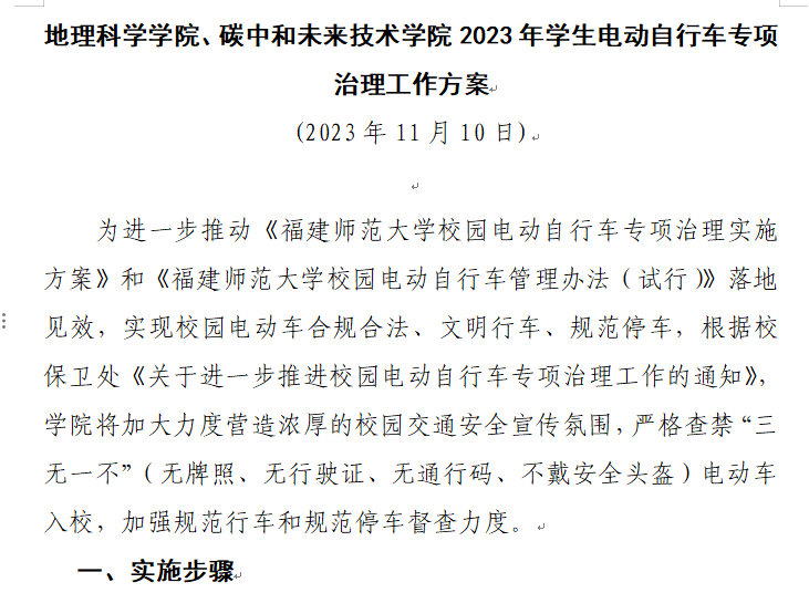 为进一步推动《福建师范大学校园电动自行车专项治理实施方案》和《福建师范大学校园电动自行车管理办法(试行)》落地见效,实现校园电动车合规合法、文明行车、规范停车,根据校保卫处《关于进一步推进校园电动自行车专项治理工作的通知》,我院制定出台《地理科学学院、碳中和未来技术学院学生电动自行车专项治理工作方案》,对学校电动车管理规定进行细化,明确学生电动车治理实施步骤、工作举措等,将学生电动车使用情况纳入学生综合素质测评,为进一步推动学生电动车治理提供了工作抓手。