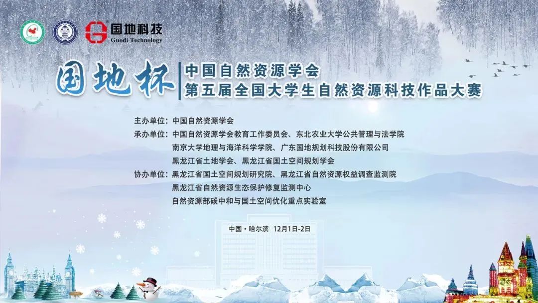 12月1-2日,由中国自然资源学会主办,中国自然资源学会教育工作委员会、东北农业大学公共管理与法学院、南京大学地理与海洋科学学院、广东国地规划科技股份有限公司、黑龙江省土地学会、黑龙江省国土空间规划学会承办,黑龙江省国土空间规划研究院、黑龙江省自然资源权益调查监测院、黑龙江省自然资源生态保护修复监测中心、自然资源部碳中和与国土空间优化重点实验室协办的中国自然资源学会“国地杯”第五届大学生自然资源科技作品大赛决赛于哈尔滨市成功举办。
