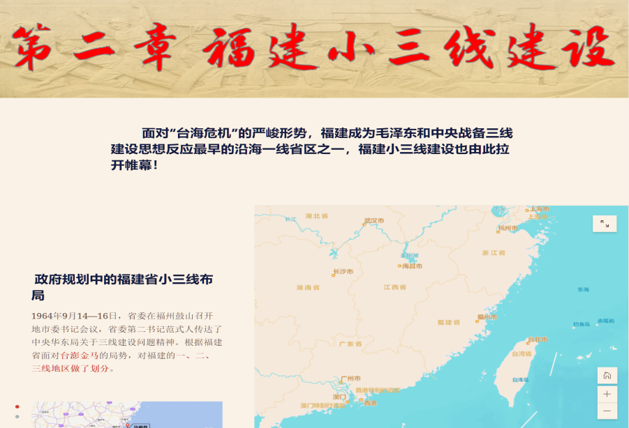 活动初始,团支书王亚兰延续之前的活动进程向支部成员更加深入地普及福建小三线建设的时代背景、建设中涌现出的历史人物和蕴含其中的三线精神。支部成员从历史与地理的角度出发,运用课程知识和专业技能,并通过GIS、Arcgisonline等专业软件制作成一幅幅独具特色的地图,继而汇总制作成了web交互式地图。这些地图以流动覆盖的新颖形式介绍了中国共产党关于三线建设的决策历程以及三线建设的时代大背景,并依据相关研究文献中对福建小三线建设公路、铁路、邮电建设的相关描述,追踪当时建设的方向,重现了当年建设的路线。最后,支部成员就“福建小三线建设”的web交互式地图故事进行宣传,并希望更多对福建三线建设感兴趣的人对此提出建议和指正,活动在支部成员的共同努力下圆满结束。